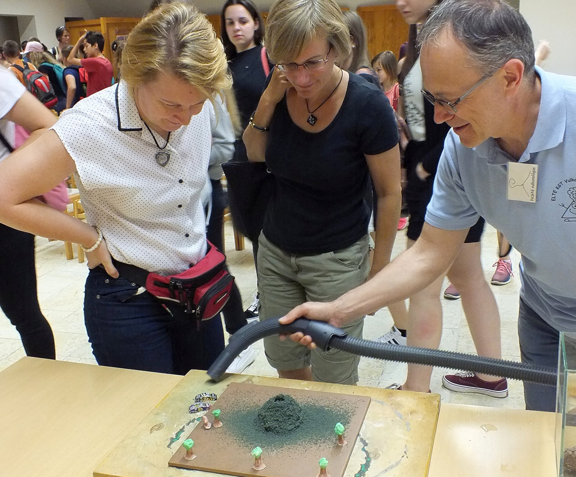 Professor Szabolcs Harangi volcanologist and two school teachers investigate the area for volcanic hazards, hit by a modelled miniature eruption