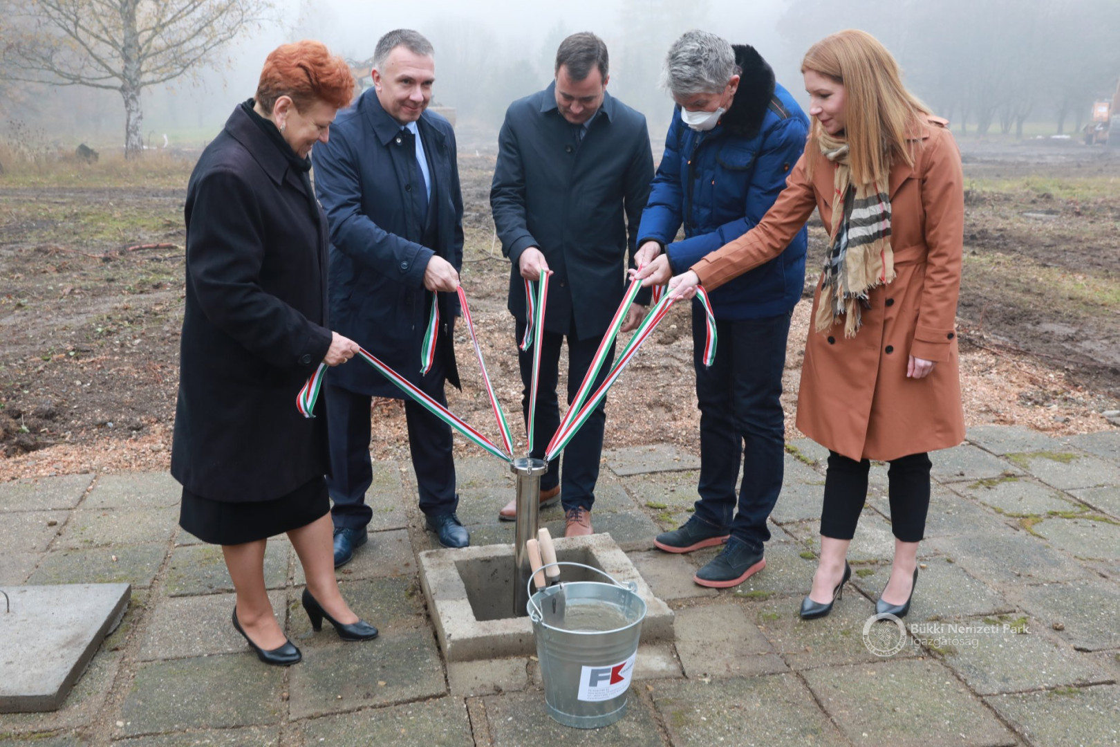 Rónai Kálmánné, Szinay Attila közigazgatási államtitkár, Rácz András környezetügyért felelős államtitkár, Kalmár László, a kivitelező FK-Raszter Zrt. műszaki igazgatója és Orosz Eszter, a MIDMAR Nonprofit Kft. ügyvezetője elhelyezik az időkapszulát az egykori Herman Ottó Emlékpark területén Fotó: Kozma Attila