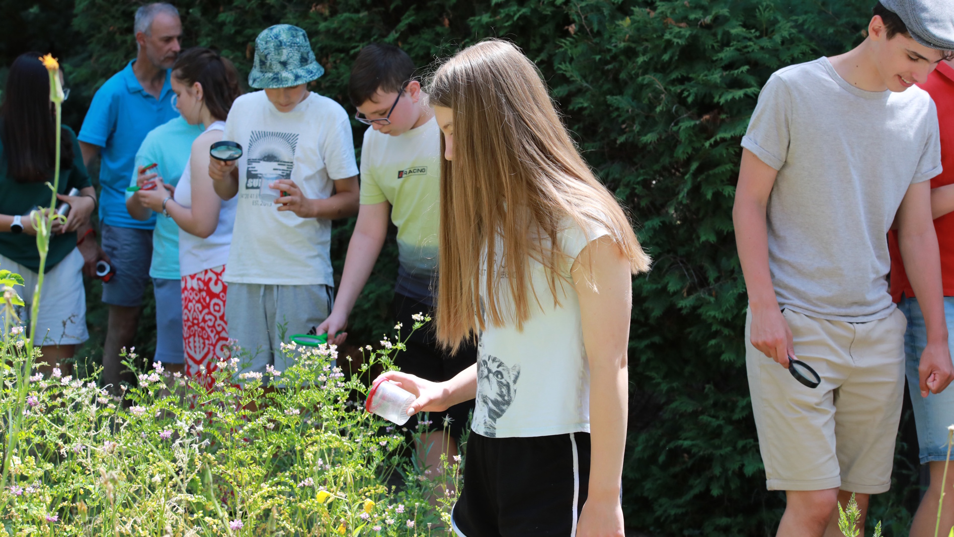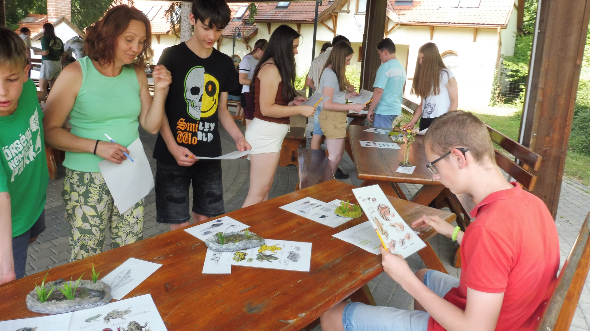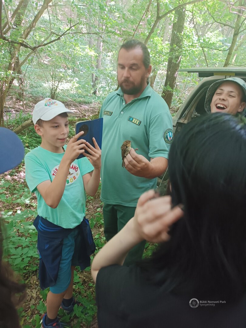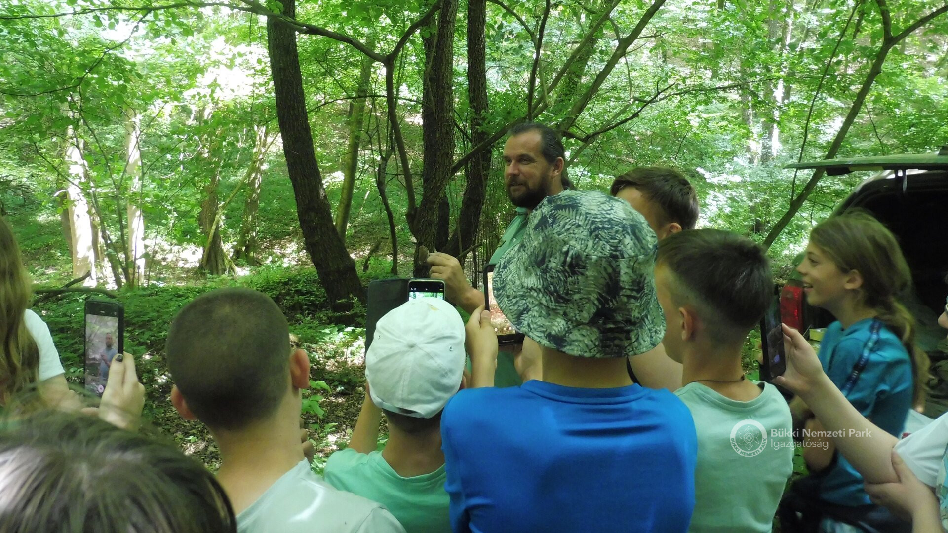 Első délelőttünkön a visszajáró táborosaink már ismerősként köszönthették Schmotzer András botanikus kollégánkat, aki ezúttal a közösségi adatgyűjtésről tartott izgalmas előadást. Hétköznapjainkat egyre több helyen szövi át a mesterséges intelligencia, kérdés, hogyan tudjuk ennek előnyös oldalait kiaknázni. A természetvédelem szempontjából pozitív példaként emelhetőek ki a közösségi adatgyűjtést segítő, népszerűsítő, és rendkívüli mértékben megkönnyítő alkalmazások. Egyik ilyen az iNaturalist nevű applikáció, melynek felhasználói felületét mutatta be András. A csütörtöki túrára tervezett adatgyűjtést megalapozva átismételtük a fontosabb beporzó csoportok (méhek, zengőlegyek, lepkék) tulajdonságait, és házi méhlegelőnkön rögtön meg is figyeltük őket. Az idei tábor sajnos újfent egy csapadékhiányos júniusra esett, az egyre gyakrabban előforduló aszályos évek kapcsán a héten kiemelt figyelmet szenteltünk a kétéltűek csoportjának. Délután a hazai kétéltűfajokat ismertük meg a legfontosabb határozóbélyegek beazonosítása révén. A napot esti denevérlessel zártuk, törpe-, vízi- és szőröskarú denevérek akadtak Gombkötő Péter zoológiai referens hálójába.