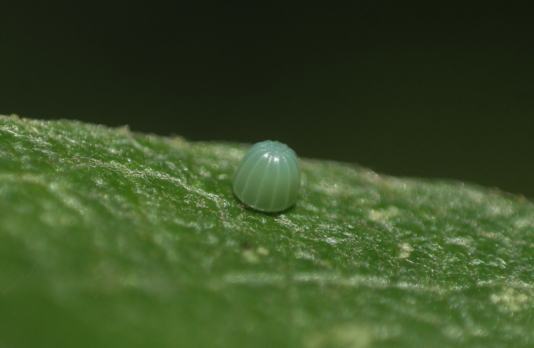 A nőstény a petéket egyesével rakja le a levelek felső oldalára. A peték halványzöld színűek, bordázottak.
