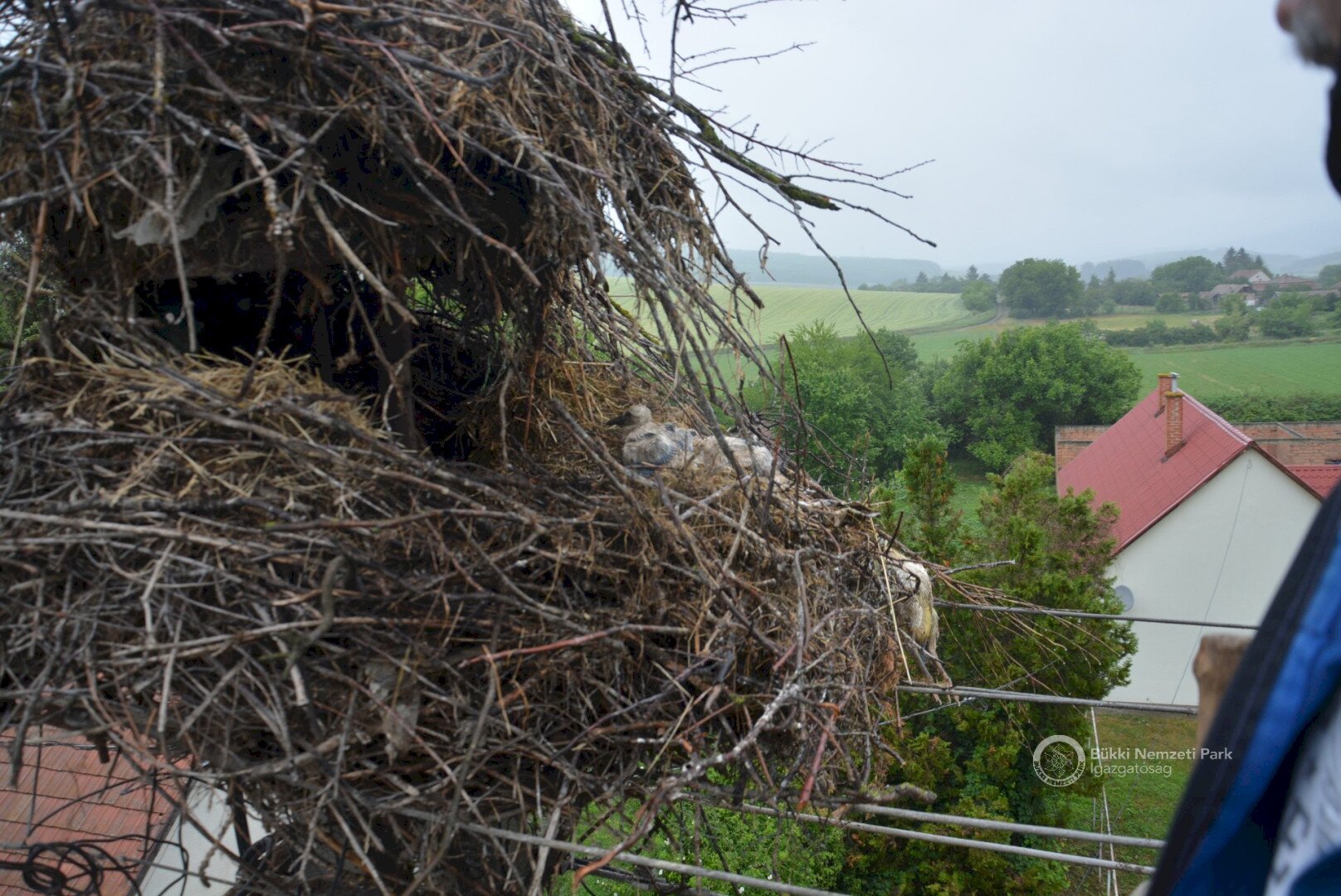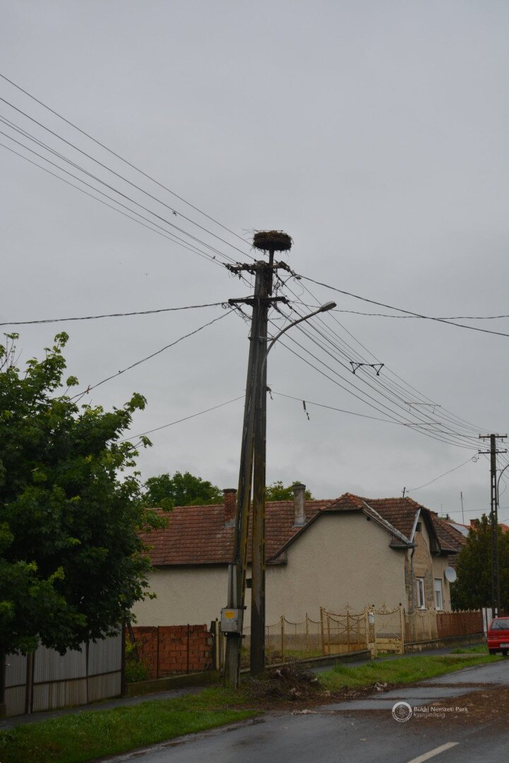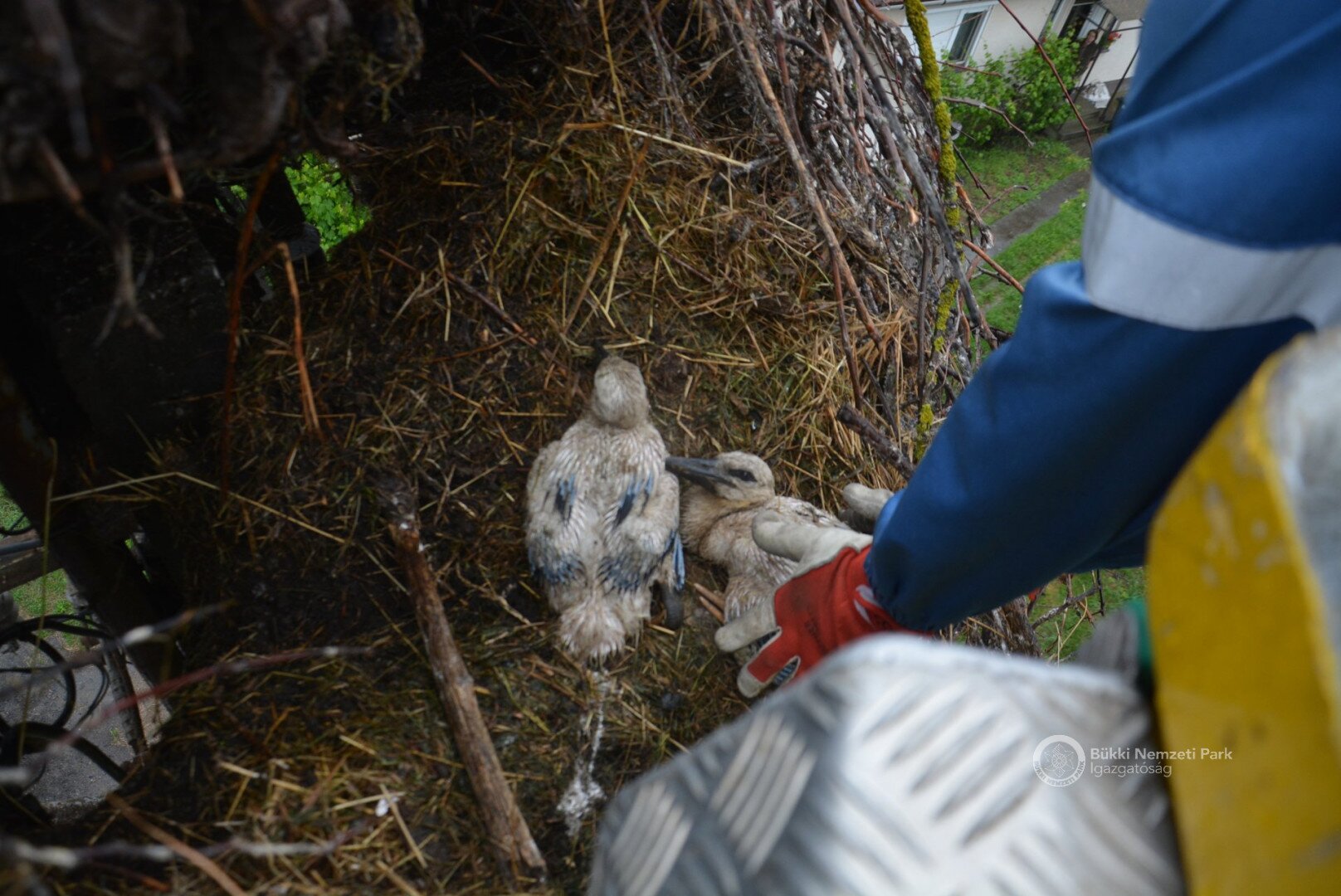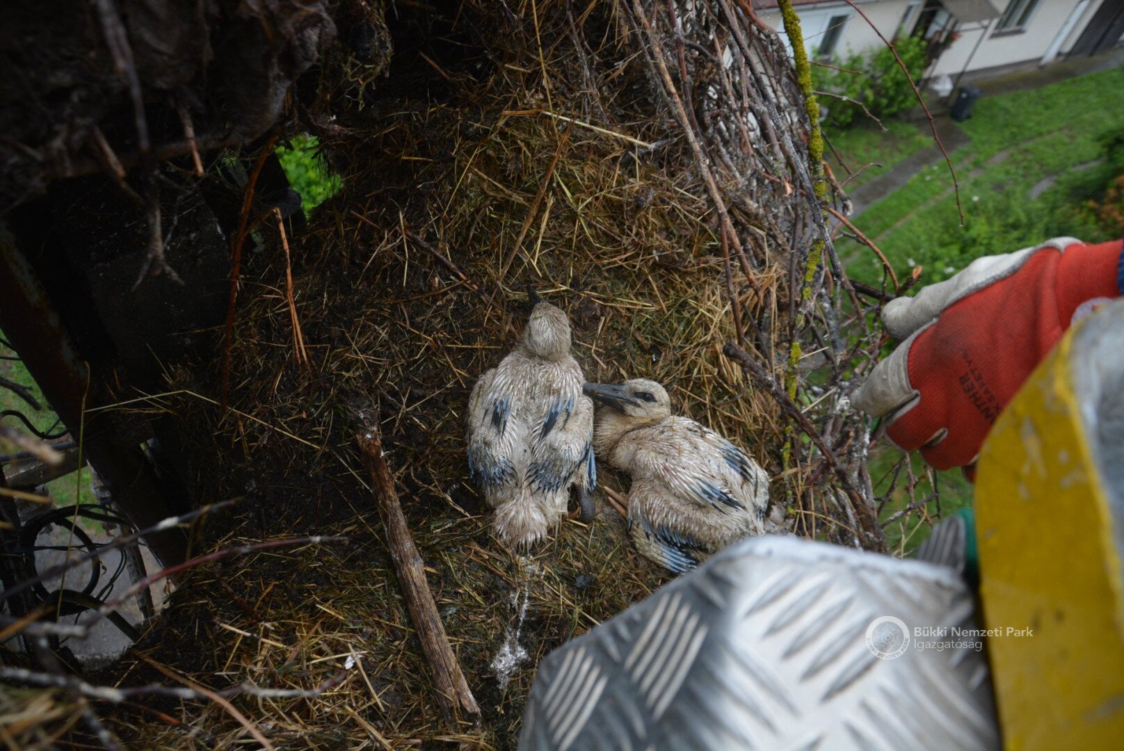 Sajnos a négyből az egyik fióka kiesett, egy másik pedig a fészekanyagban, illetve a vezetékekben akadt fenn, így mindketten elpusztultak. Viszont a két kisebb fészektestvérük benne maradt a megdőlt fészekcsészében. Néha kisebbnek lenni is lehet előny... A riasztás után a Nógrádi tájegység felvette a kapcsolatot az MVM-ÉMÁSZ-szal és egy emelőkosaras gépjármű formájában meg is érkezett a segítség. Az áramtalanítás után először a fiókákat helyeztük biztonságba, majd a fészekanyag leszakadt részeit távolítottuk el. Ezután a fészektartón lévő megmaradt fészekanyag mennyiségét csökkentettük az optimális szintre, és egy új fészekcsészét alakítottunk ki benne, ahová visszahelyeztük a két életben maradt fiókát. Az öreg madarak végig figyelték a mentési, helyreállítási mozzanatokat, majd ők maguk is hordani kezdték a fészekanyagot.