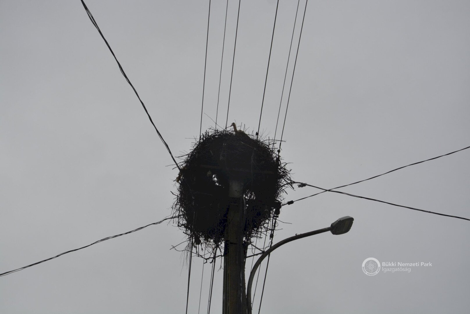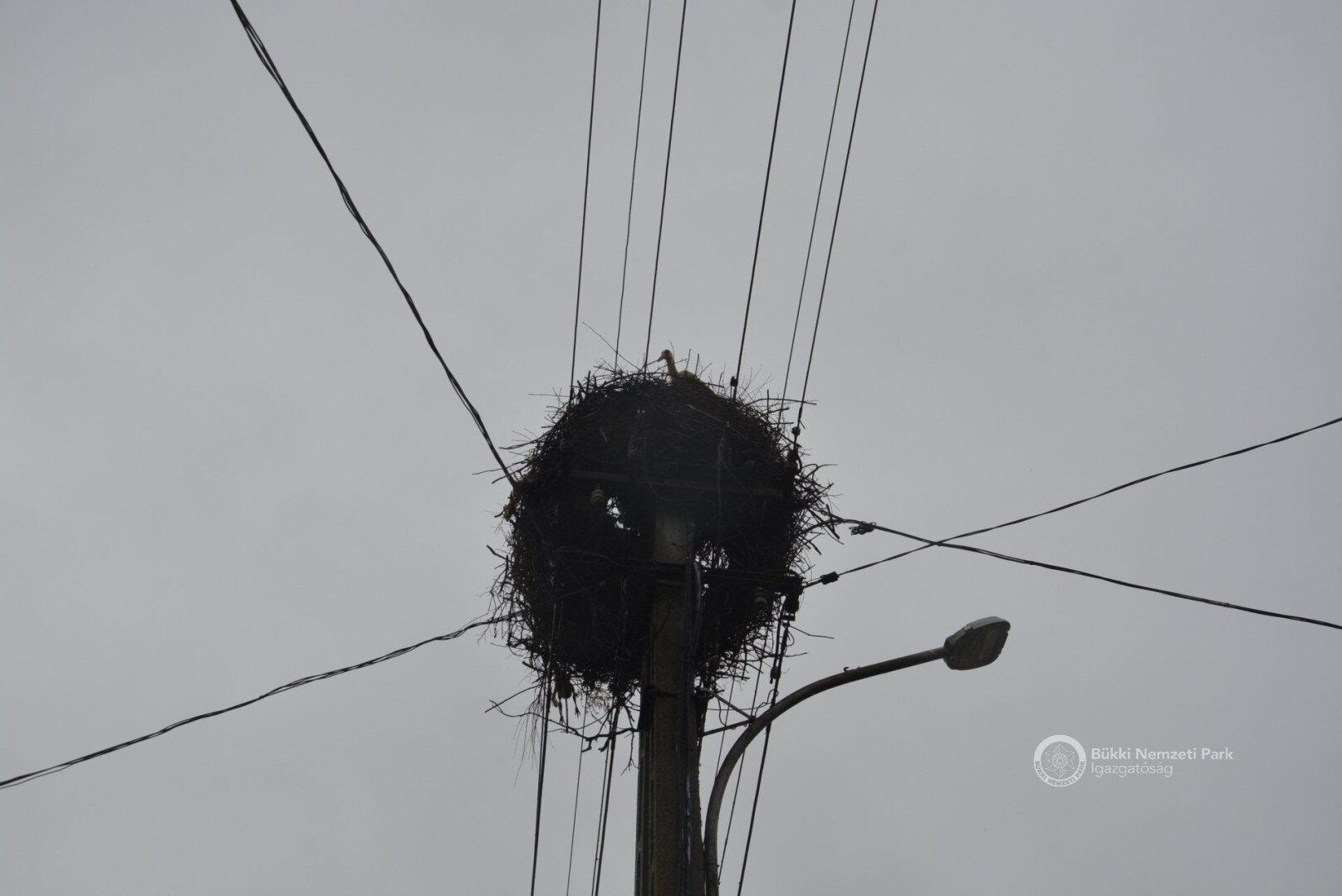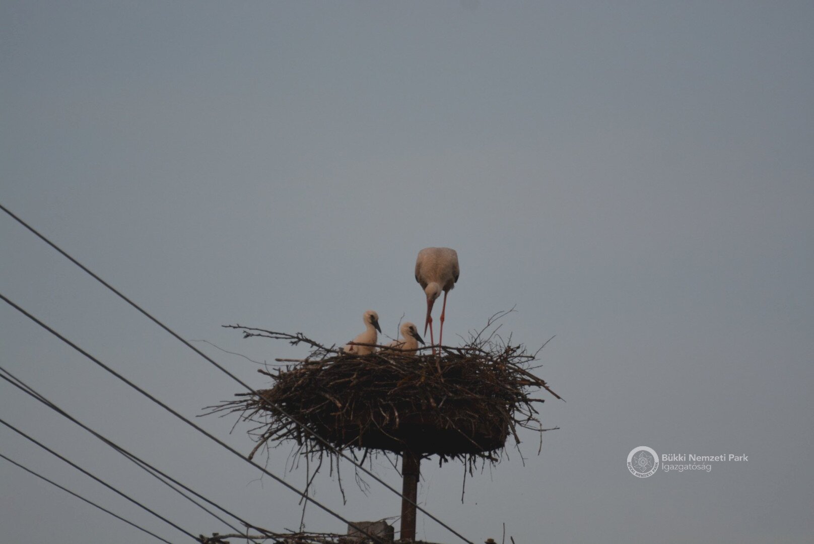 Sajnos a négyből az egyik fióka kiesett, egy másik pedig a fészekanyagban, illetve a vezetékekben akadt fenn, így mindketten elpusztultak. Viszont a két kisebb fészektestvérük benne maradt a megdőlt fészekcsészében. Néha kisebbnek lenni is lehet előny... A riasztás után a Nógrádi tájegység felvette a kapcsolatot az MVM-ÉMÁSZ-szal és egy emelőkosaras gépjármű formájában meg is érkezett a segítség. Az áramtalanítás után először a fiókákat helyeztük biztonságba, majd a fészekanyag leszakadt részeit távolítottuk el. Ezután a fészektartón lévő megmaradt fészekanyag mennyiségét csökkentettük az optimális szintre, és egy új fészekcsészét alakítottunk ki benne, ahová visszahelyeztük a két életben maradt fiókát. Az öreg madarak végig figyelték a mentési, helyreállítási mozzanatokat, majd ők maguk is hordani kezdték a fészekanyagot.