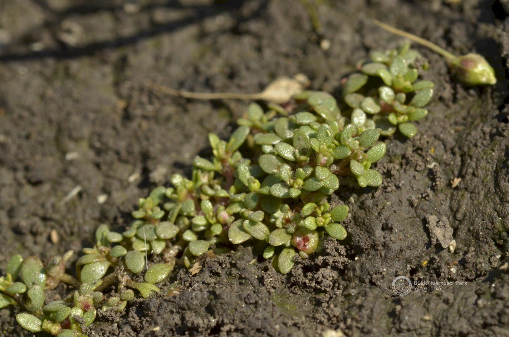 Pár centiméteres pocsolyalátonya (Elatine alsinastrum) növényke nedves felszínen
