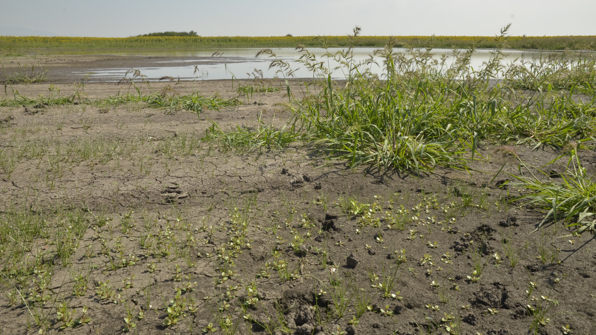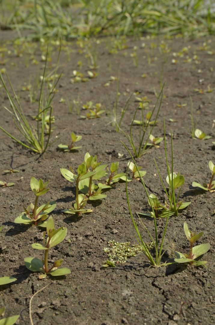 Apró iszapnövényzet (előtérben) és közönséges kakaslábfű (Echinochloa crus-galli) tömege nyílt felszíneken