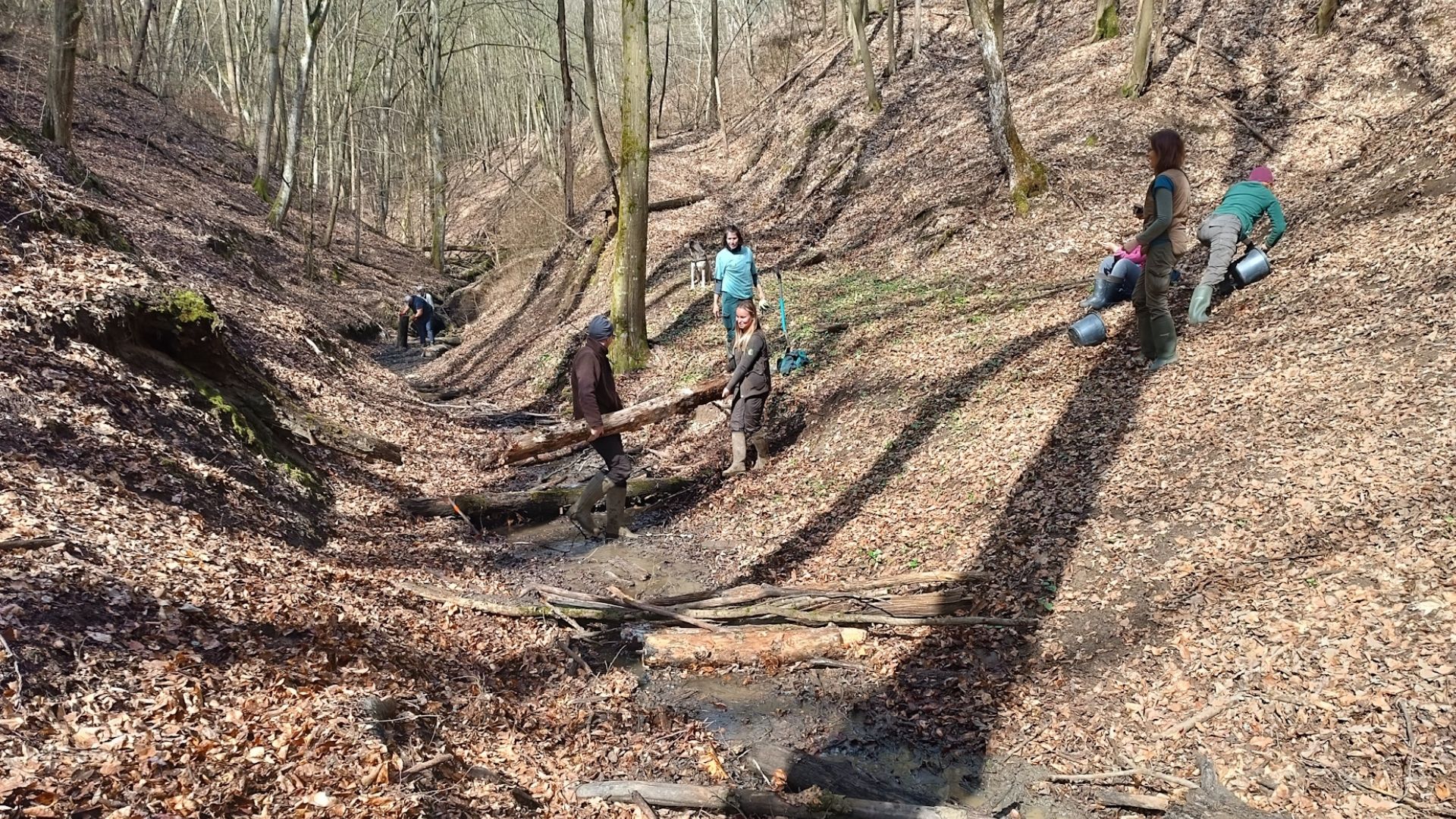 A közös terepmunka célja a vízmosásban áramló víz lelassítása volt: a természetes folyamatokat utánozva számos ponton kisebb rönkgátakat építettünk, megszüntettük a kialakuló mederbevágódásokat, amelyek gyorsítják a víz lefolyását, tereprendezéssel kisebb vízgyűjtő medencéket alakítottunk ki, illetve a vízfolyást meanderezésre kényszerítő törzseket helyeztünk a mederbe.