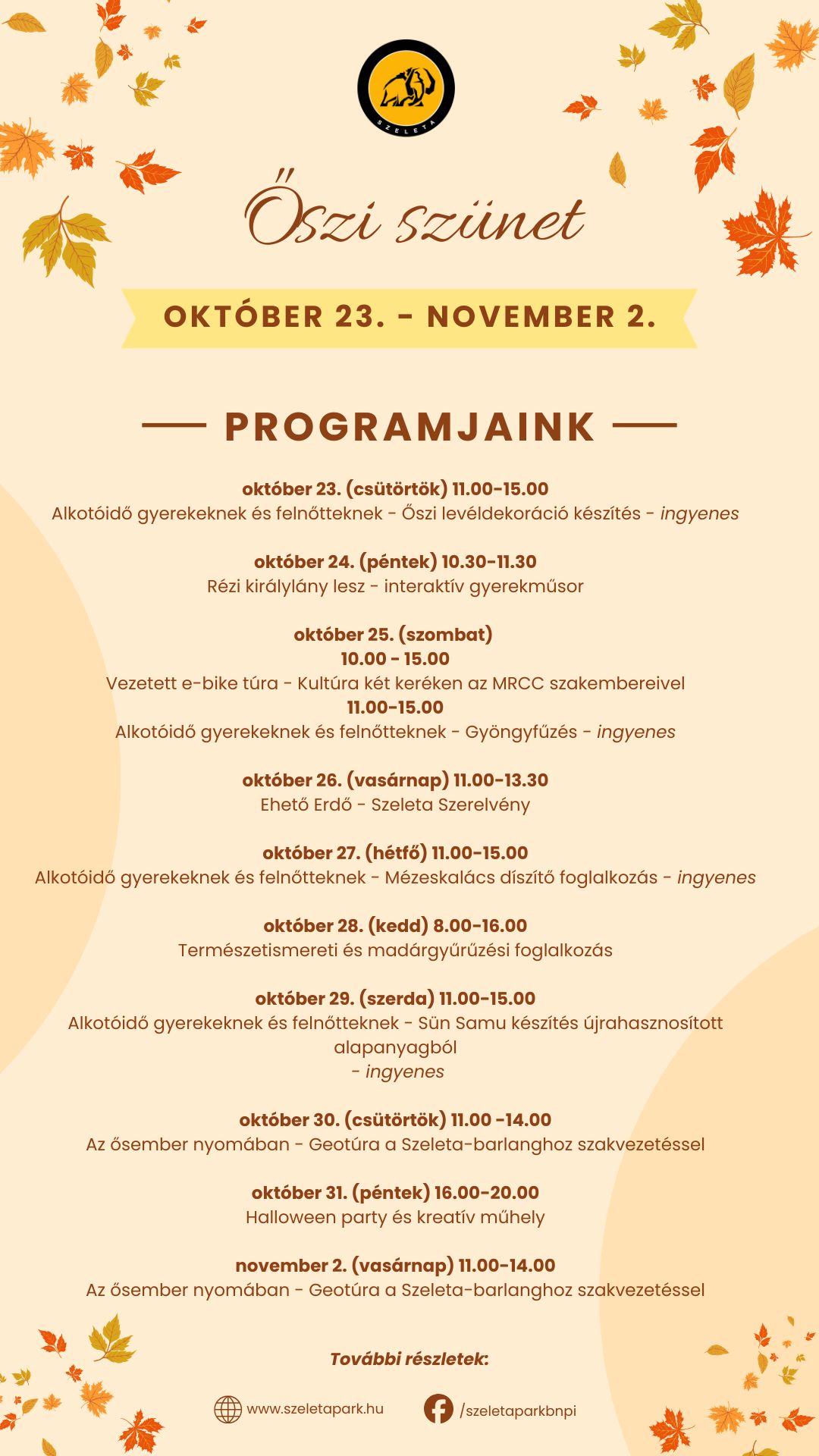 Az iskolai őszi szünet ideje (október 23 - november 2.) alatt mindennap nyitva tartunk és extra programokkal várjuk az érdeklődőket.