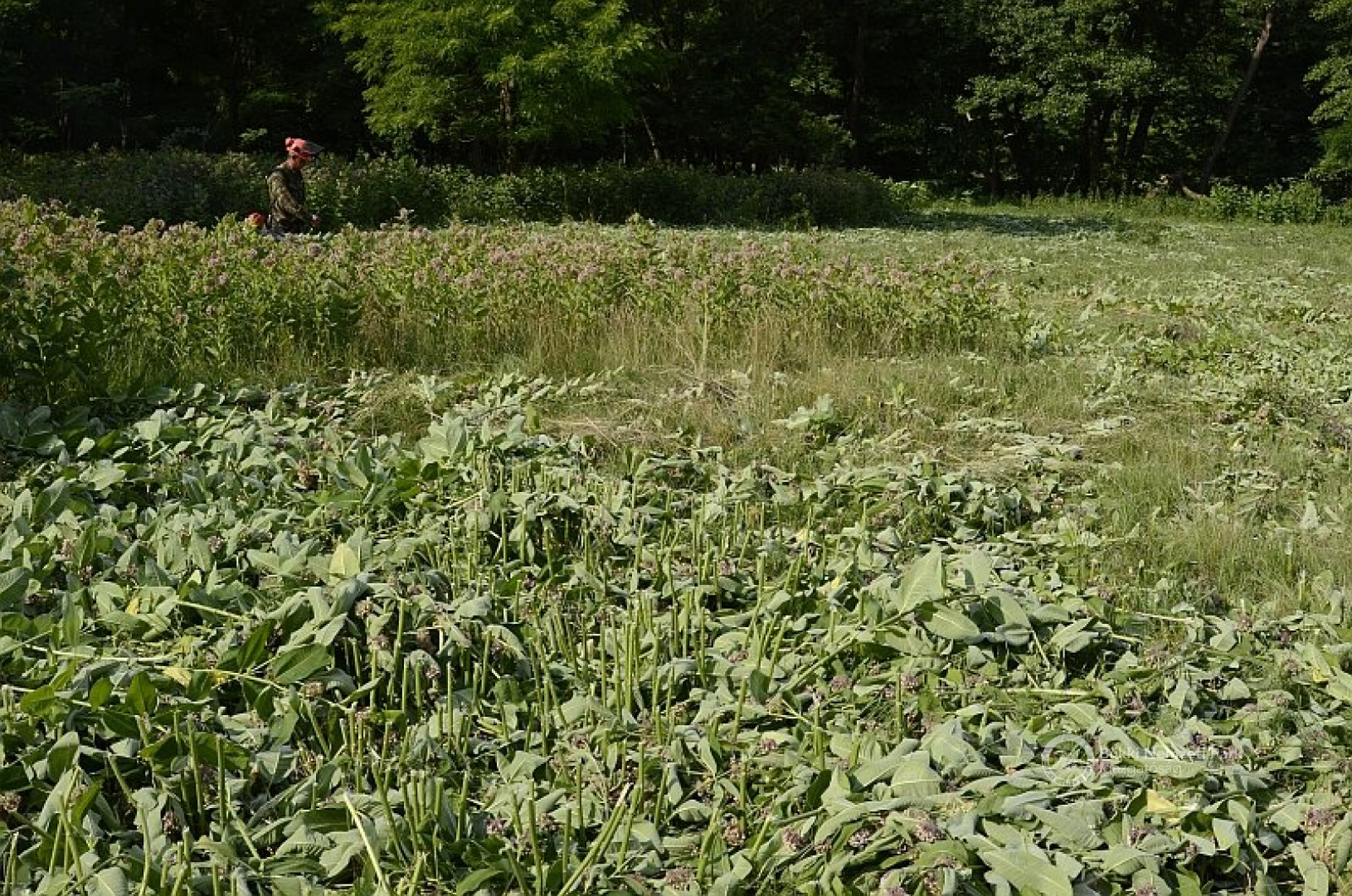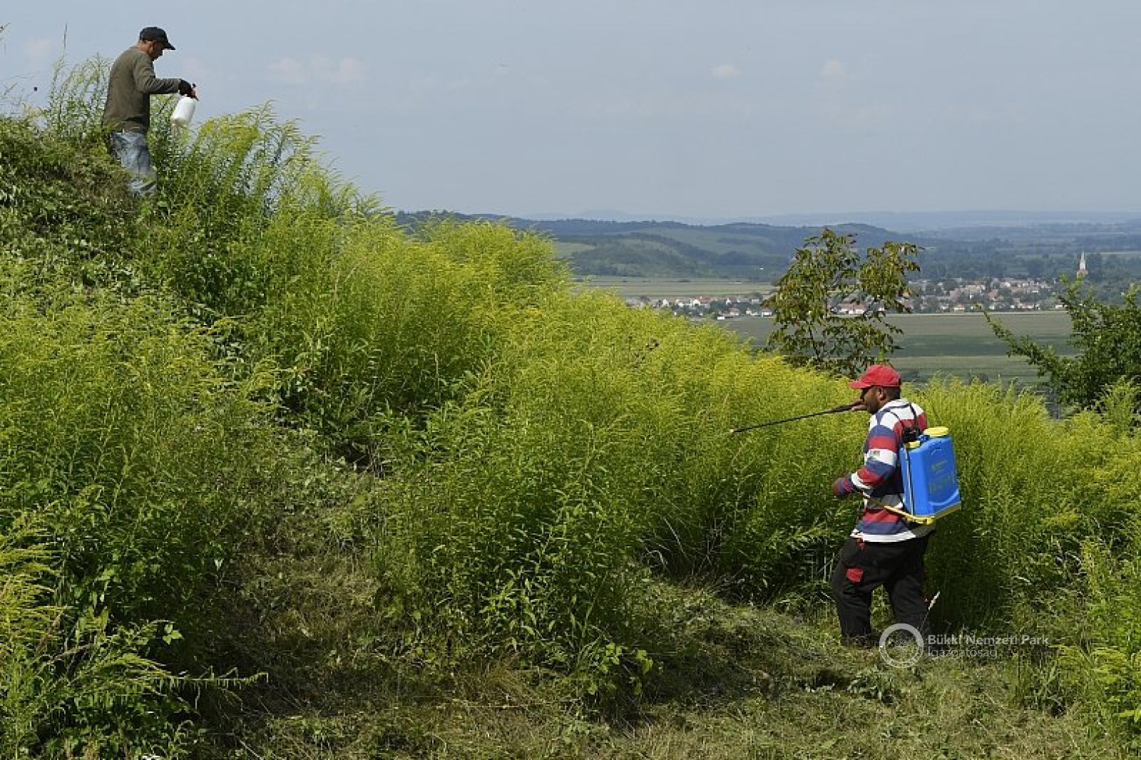 A problémát felismerve néhány éve kezdtük a természetvédelmi célú területkezelést az özönnövények, valamint az inváziós tulajdonságú és gyomfajok (pl. siska nádtippan, seprence) elleni munkára összpontosítani. Értékes félszáraz és üde gyepjeink, diverz életközösségeink fenntartása, védett növényeink és állataink megóvása érdekében a BNP Igazgatóság vagyonkezelésében levő ingatlanokon kézi és gépi munkákat folytatunk a nyár második felétől október végéig. A Lázbérci és a Tarnavidéki Tájvédelmi Körzetben 2020-ban közel 40 hektáron történt akác vegyszeres injektálása, gépi szárzúzás, kézi kaszálás és permetezés. A közönséges selyemkóró leveleinek kenését, virágbimbós hajtásainak pontpermetezését, az akáctörzsek fúrásos injektálását lassan hagyományosnak mondhatjuk és hatásosnak tartjuk. A kanadai aranyvessző ellen ez idáig elsősorban mechanikai módon védekeztünk, de idén a kémiai úton történő beavatkozást is kipróbáltuk. Az első tapasztalatok nyomán a selyemkóró ellen már bizonyított glifozát tartalmú vegyszer kijuttatásának optimális ideje és módja azonban még további finomításra szorul.
