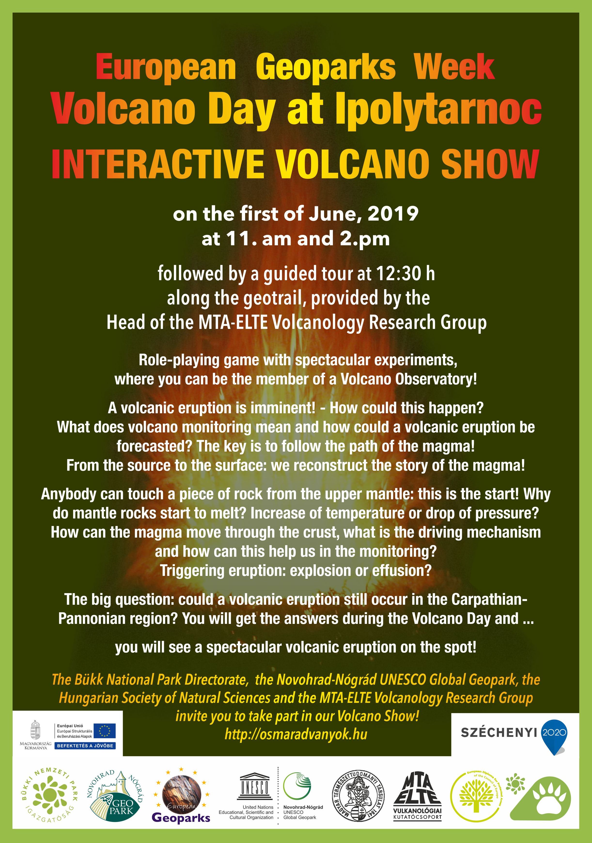 A vulkánshow után a bejelentkezők a 12 óra 30 perckor geológiai tanösvénytől induló vulkántúrán vehetnek részt, hozzájuk a fogadóépülettől délben induló tematikus túrázók csatlakozhatnak. Íme a vulkánshow kedvcsináló plakátja: